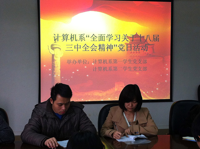 党的十八届三中全会已于本月十二日闭幕,大会就未来十年以及更长时间内的改革发展做出了全面决策,会议精神也陆续以公报、决定等形式出现。为学习领会和把握会议精神, 11月29日中午,在我系第一学生党支部书记何祉谕及第二学生党支部书记杨平的组织带领下,计算机系共41名学生党员在信息楼3楼教师会议室集中学习了党的十八届三中全会精神。