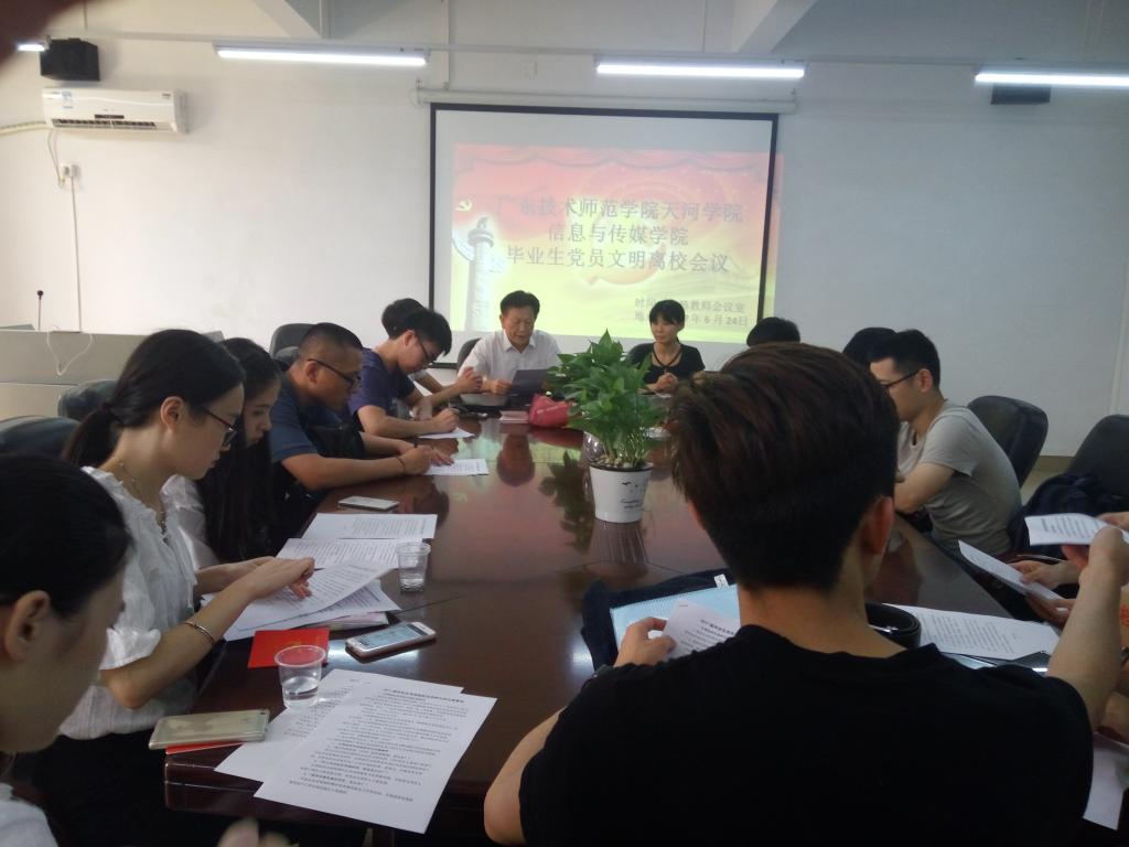 6月24日,我院在信息楼教师会议室召开信息与传媒毕业生党员离校会议,出席本次会议的有信媒党总支书记袁颂皎以及2017届全体毕业生党员。