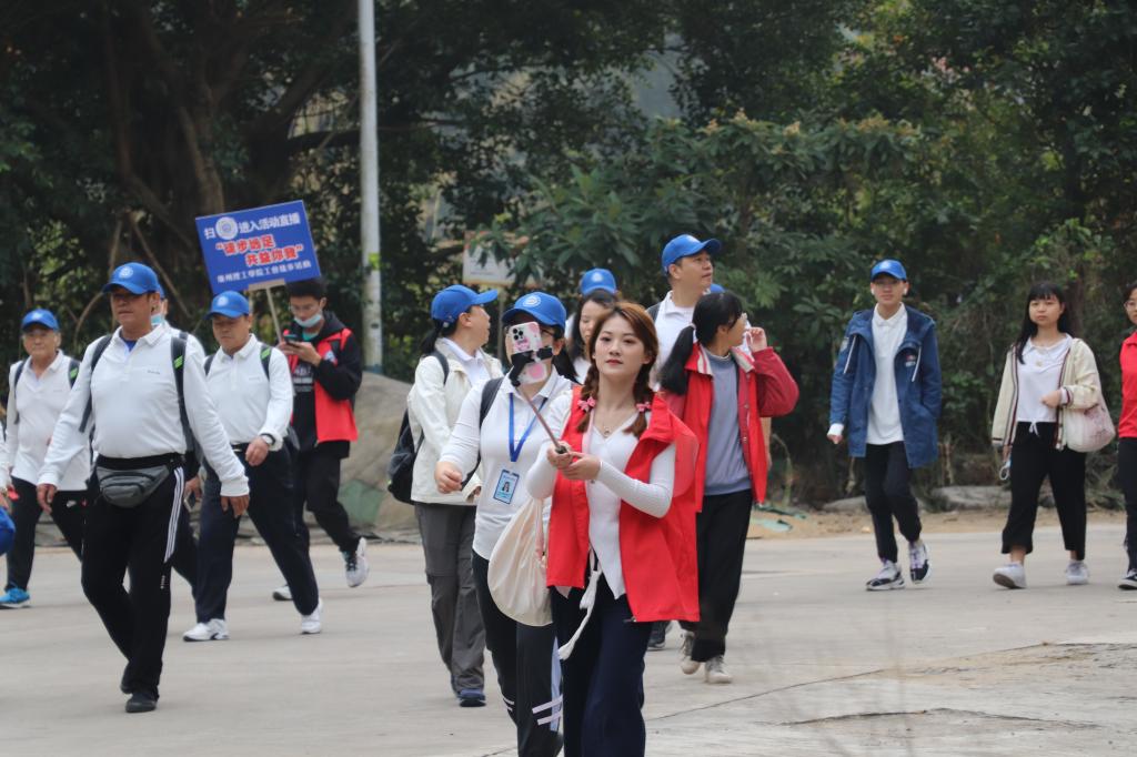 大家一边感受沿途美景,一边交流学期工作,一边品读东江纵队的历史,共话新时代美好生活。大家步履轻快,头顶蓝天白云,脚下一路黄叶,不知不觉间2个多小时已经过去,终于成功登顶。整个登山队伍中,年龄最小的3岁、最大的68岁,上下20公里的徒步,无一人掉队,展现出了广州理工人良好的精神风貌。