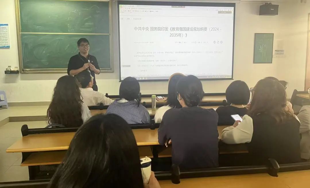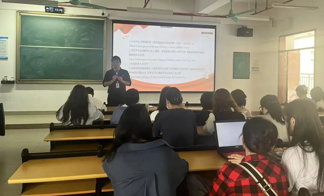 蔡书记强调,作为教育工作者,必须深入研读纲要,紧跟教育发展新趋势和新要求,积极投身于教育创新实践。他提出,我们应坚持德育为先,全面提升学生综合素质,致力于培养德智体美劳全面发展的社会主义建设者和接班人。此外,他还强调了教育现代化对广东在中国式现代化建设中的战略意义要求大家认真学习领会大会精神,结合学院实际,积极探索教育创新的新路径和新方法。在会议讨论环节,与会党员纷纷发言,就如何落实教育大会精神、提升教育教学质量、加强师德师风建设等方面进行了深入交流和探讨。大家一致认为,此次会议内容丰富、意义重大,为我们今后的工作指明了方向、提供了遵循。会议在热烈而务实的氛围中圆满结束。蔡书记在总结发言中强调,全体教工党员要以此次会议为契机,进一步增强责任感和使命感,将学习成果转化为实际行动,为推动学院乃至全省教育事业高质量发展贡献自己的力量。