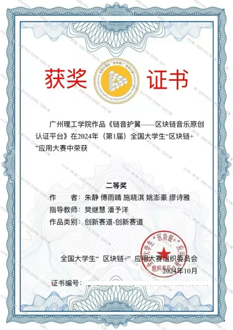 据悉,全国大学生“区块链+”应用大赛是一项全国性的技能竞赛,旨在鼓励和促进区块链技术在高等教育领域的应用与实践。大赛面向全国的研究生、本科生和专科生,本次比赛汇聚了全国众多高校的优秀团队,竞争异常激烈。我院参赛团队获奖作品是“链音护翼”,其针对音乐市场数字化转型中版权侵权频发、传统版权保护机制不足及法律滞后性等痛点,创新性地运用区块链与AIGC技术为音乐版权保护提供解决方案。该项目平台允许创作者轻松登记作品,并利用区块链技术自动生成唯一哈希值,为每首音乐作品打造不可篡改的数字指纹。项目旨在创建安全、公正、高效的版权保护环境,有效维护音乐创作者和版权所有者的权益,推动音乐产业的健康繁荣发展。