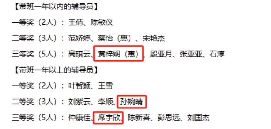 本次比赛面向全体辅导员老师,共分为两个赛道,带班一年以内的辅导员和带班一年以上的辅导员,在辅导员带班人数中随机抽取10名同学照片,辅导员需对学生的姓名、专业班级、政治面貌、寝室号、家庭住址、违纪处分情况和奖助情况等7个维度进行解答,最终通过得分评定获奖等级。经过辅导员老师的精心准备、走访谈话等,最终我院3名教师在众多辅导员中脱颖而出,其中,广州校区孙婉晴老师获得带班一年以上辅导员二等奖,席宇欣老师获得带班一年以上辅导员三等奖,惠州校区黄梓娴老师获得带班一年以内的辅导员三等奖。