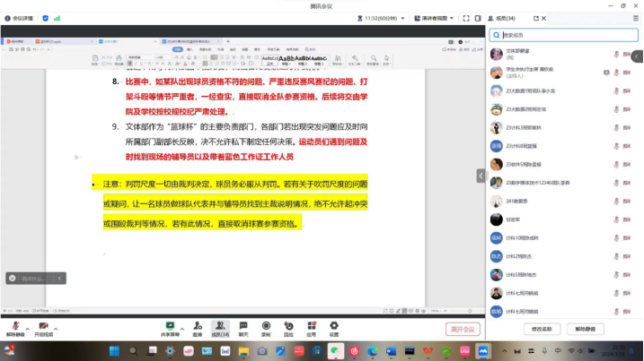 会上,计算机学院学生会主席黄钦俞发表了热情洋溢的致辞。他希望通过此次领队会议,能够增强团队凝聚力与向心力、明确赛事规则与要求,为今后的“篮球杯“比赛更能顺利进行。随后,黄钦俞主席就本次篮球比赛的赛程安排、比赛规则以及注意事项等进行了详细介绍,确保各领队对比赛有清晰的认识和理解。同时,他也提醒各领队要关注队员的身体状况,合理安排训练和比赛,确保队员的身体健康。
